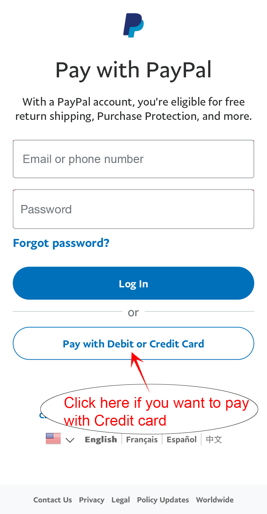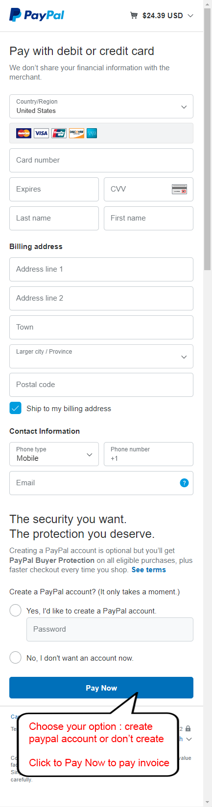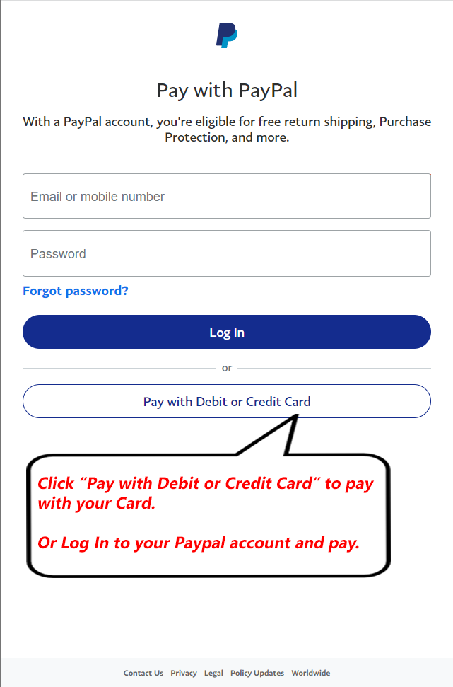 2. Next screen, You can login to your Paypal account to pay or click to “Pay with Debit or Credit Card” to pay with your Card.