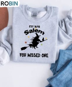 The 1692 Salem You Missed One Shirt Salem Halloween Short Sleeve Sweatshirt is a fashionable and trendy item perfect for Halloween celebrations. The shirt features an eye-catching design that pays homage to the notorious events that occured in Salem in 1692. The short sleeve sweatshirt is comfortable to wear and made with high-quality materials to ensure durability. Whether you are attending a costume party or just want to add a touch of spooky style to your wardrobe, this shirt is a must-have. Grab it while stocks last and showcase your love for all things Salem and Halloween.