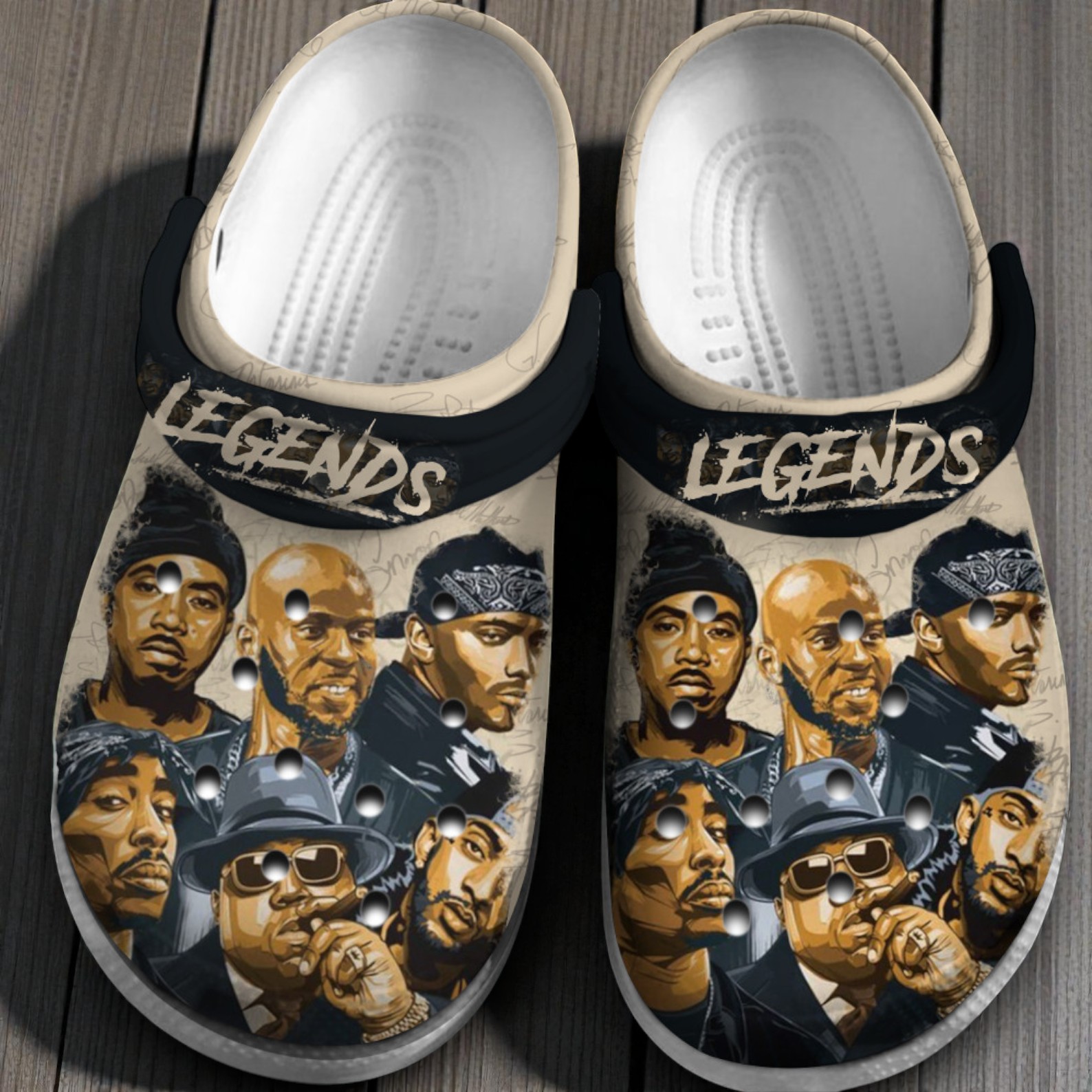 Are you still listening to the golden era of rap? We designed these beige Crocs specifically for old-school hip-hop fans. The graphics feature a tribute to some of the absolute greatest to ever do it—including Tupac Shakur, The Notorious B.I.G., DMX, Eazy-E, Nas, and Nipsey Hussle. The artwork has a smooth black and gold vibe, set against a background of subtle handwritten script, with the word "LEGENDS" printed right across the top strap.
