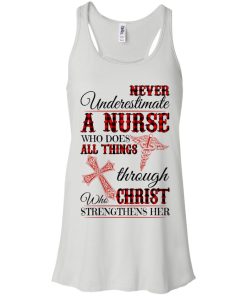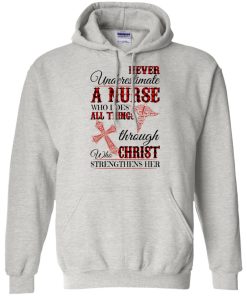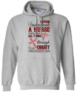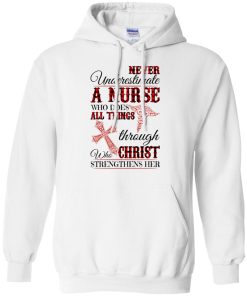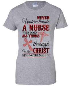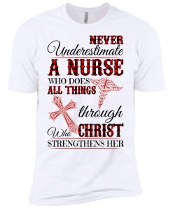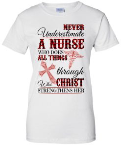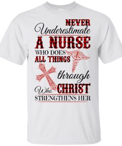 Never Underestimate A Nurse Who Does All Things Through Christ Who Strengthens Her shirt. Buy it now, from $19.99 and $3.99 shipping. This shirt available in t shirt, long sleeve, hoodie and multiple color.
