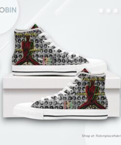 Step into legendary style! Rock these classic high tops inspired by hip-hop royalty. Bold colors and iconic imagery pay tribute to groundbreaking music. Comfort meets cool in this must-have footwear for true fans. Limited stock, grab yours before they're gone!