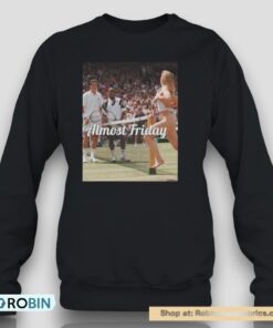 Are you tired of boring, basic t-shirts? Say goodbye to bland fashion and hello to the ultimate conversation starter with our unique Almost Friday Wimbledon Streaker Unisex Shirt! Stand out from the crowd and inject some personality into your wardrobe with this eye-catching design. Whether you're hitting the town or lounging at home, this shirt is sure to make a statement and turn heads wherever you go. Don't miss out on your chance to add a touch of fun and humor to your outfit – order yours today!