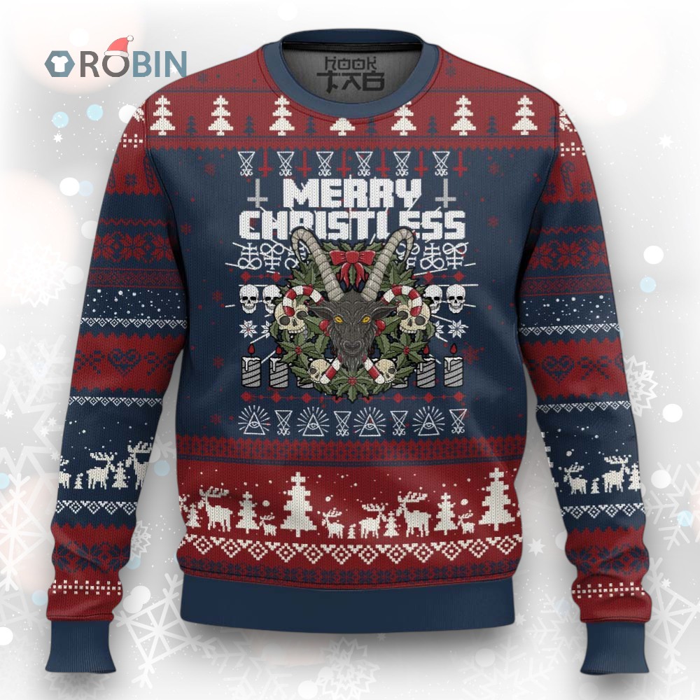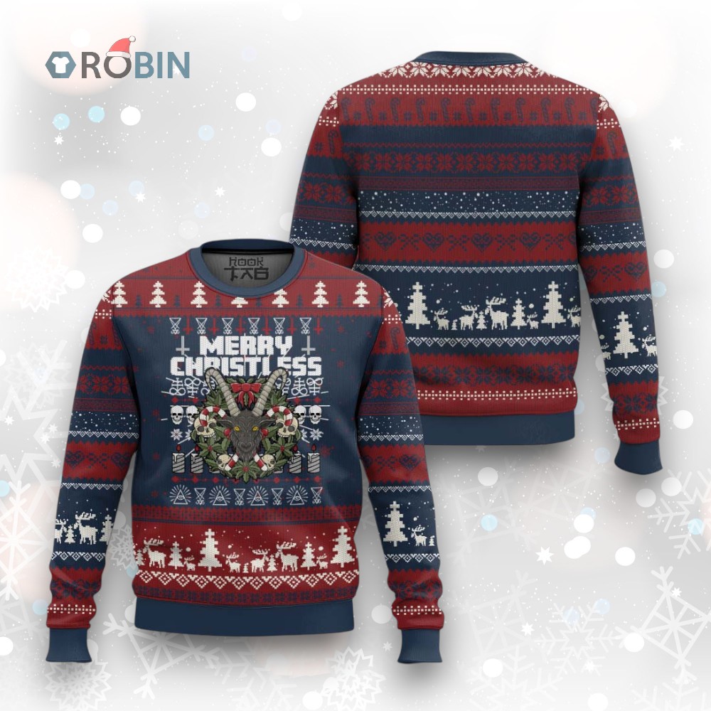 Embrace the darkness this holiday season! Show off your unique style with this festive and blasphemous wreath-themed sweater. Perfect for those who prefer a less traditional celebration. Get yours now and spread some delightfully devilish cheer! Limited quantities available.