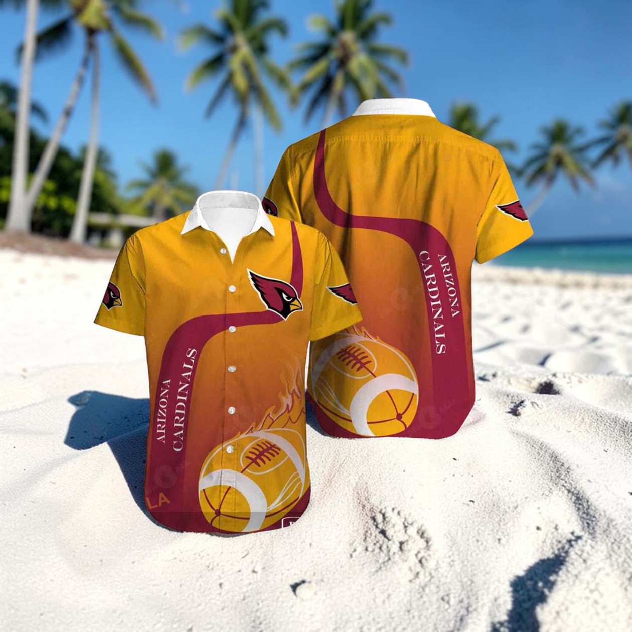 Sunlight filters through swaying palm fronds, casting dappled shadows on a vibrant canvas that bursts with the energy of the Southwest and the spirit of the gridiron. A gradient from fiery yellow to deep red flows across the shirt like a desert sunset, setting the stage for bold Arizona Cardinals imagery that commands attention. The iconic cardinal mascot is rendered with a retro edge, perched confidently amid stylized footballs and tropical palm leaves. Vertical stripes carrying the team name in crisp, serif-like caps slice through the design, adding structure and a nod to classic sports graphics. This isn’t just a nod to fandom; it’s a celebration of identity layered with sunlight and grit, perfect for those who carry their Cardinals pride beyond the stadium. Whether rooting from the sidelines or soaking in vacation vibes, the design captures an effortless blend of athletic passion and laid-back island spirit. Fans who appreciate the intersection of bold team symbolism and distinctive, almost vintage artwork will recognize the care poured into every stitch and print. Gifting this to someone who lives and breathes Cardinals football, or who loves a striking shirt that holds true meaning beyond style, feels genuinely thoughtful. It’s a piece that anchors a community of supporters, a shared statement that’s as much about loyalty as it is about celebrating life in full color under an open sky. The Arizona Cardinals Hawaiian Shirt brings that vibrant energy to anyone ready to wear their allegiance with an unmissable boldness.