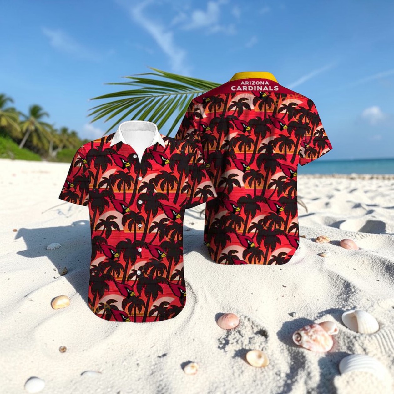 A red gradient sweeps across the fabric like a late-day sky dissolving into dusk, rich and warm. Black palm trees rise sharply against this bold backdrop, their silhouette creating a striking contrast that captures a tropical vibe with an edge. Yellow accents punctuate the design subtly, adding a spark of brightness that echoes the sun’s final rays. Scattered throughout, the iconic Cardinals logo weaves into the pattern naturally, more than a simple brand stamp—it’s a symbol of allegiance wrapped in island spirit. This Arizona Cardinals Hawaiian shirt feels like a celebration of both team pride and laid-back, vacation-ready style. It suits someone who wears their fandom with confidence but isn’t afraid to mix it up with something a little unexpected—a nod to the retro sunset hues alongside the unmistakable energy of the Cardinals. It's the kind of shirt that slips easily into a weekend getaway, tailgate party, or casual summer event, adding a bit of personality without shouting for attention. Pair it with sun-bleached shorts, simple sneakers, or even canvas slip-ons for a day that might wander from beachfront to backyard grill. This shirt resonates with Cardinals fans who appreciate more than just the game; it’s for those who enjoy the lifestyle surrounding their team, with a blend of fun and flair that’s perfectly at home on or off the field. For anyone searching for an Arizona Cardinals Hawaiian shirt that’s both spirited and stylish, this one fits naturally into a relaxed but proud wardrobe.