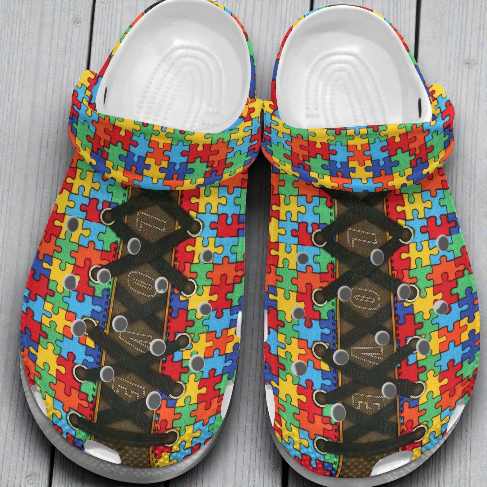 Sunlight brightens the room, dancing off the glossy surfaces of rainbow-colored puzzle pieces scattered across smooth off-white interiors. These puzzle pieces, interlocked and vivid, swirl playfully around the base of a pair of Crocs—a visual celebration encoded in every color, from warm reds and oranges to deep teals and purples. The contrast between the vibrant pattern and subtle cream backdrop pulls the eye, while metal eyelets punctuate the silhouette with just the right amount of edge. A delicate lacing detail hints at classic footwear craftsmanship, grounded in a contemporary statement that speaks louder than words. The design doesn’t just rest on aesthetics; it carries the weight of inclusivity and solidarity. Puzzle pieces have long symbolized autism awareness, each color reflecting the spectrum of experiences and strength found in this community. Wearing these Crocs becomes more than a choice in comfort—it’s a way to show alignment with a cause, a nod to connection and understanding that extends beyond the shoes themselves. Those who choose this style often wear it as a badge of support, whether they are family members, friends, or advocates who want something bold yet approachable. This pair’s playful energy fits seamlessly into everyday life, whether paired with casual jeans running errands or layered with colorful socks on a relaxed weekend. They work for someone who values comfort without sacrificing personality—someone who doesn’t just walk through their day but carries a message of awareness wherever they go. As a gift, these Crocs offer thoughtful resonance, a tactile reminder of support that can be worn on busy streets or at relaxed gatherings, blending a casual vibe with a purposeful identity. For anyone drawn to the Autism Awareness puzzle pieces Crocs, it’s a grounding, joyful expression, insisting that even everyday shoes can carry a story worth telling.
