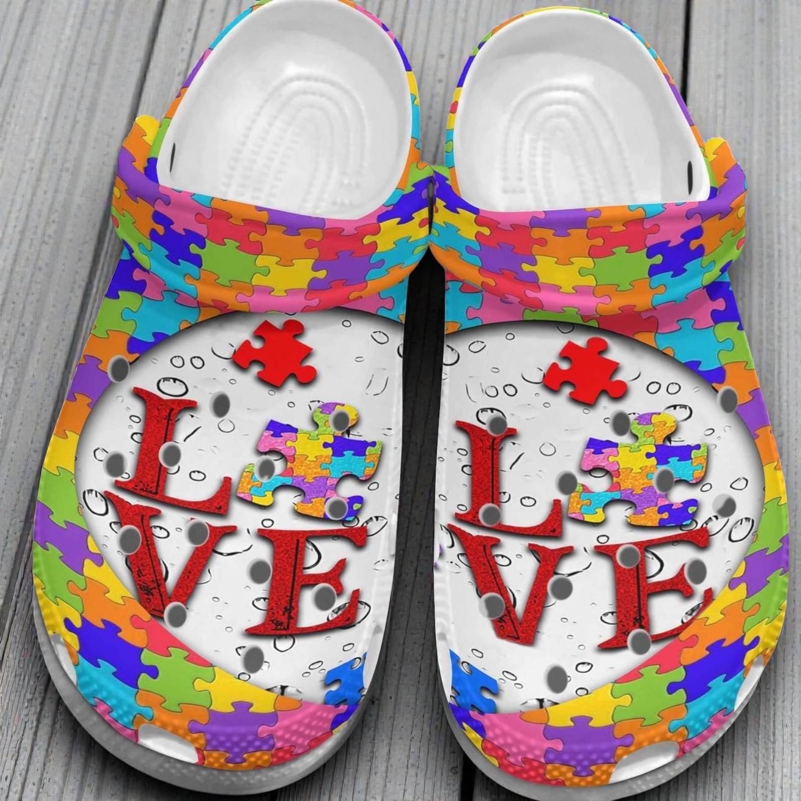 Bright splashes of color spread across a familiar silhouette, each puzzle piece interlocking with intention. The classic Crocs base carries a mosaic of vibrant shapes that curve naturally with the shoe’s contours, tracing a lively border that frames a bold LOVE in deep red serif typography. Behind this focal point, a muted gray splash offers a subtle backdrop, allowing the colorful puzzle pieces to catch the eye without overwhelming it. The design strikes a balance between playful energy and thoughtful clarity. Puzzle pieces have long symbolized connection and complexity, making their arrangement here a quiet nod to the diversity and depth found within the autism community. This is not just footwear, but a canvas celebrating individuality through pattern and color, while firmly placing the message at the center. Those who gravitate toward the Autism Awareness Puzzle Crocs often appreciate how self-expression extends beyond clothes and accessories—it’s an affirmation worn visibly, without needing words. Whether trusted friends, family members, or advocates find these meaningful, the shoes serve as everyday reminders of inclusion and understanding. They fit seamlessly into daily activities, carrying supportive intentions from the house to fundraising events to casual outings. The design doesn’t shout but shares a steady, uplifting statement—one that resonates with those eager to wear their values alongside their personality.