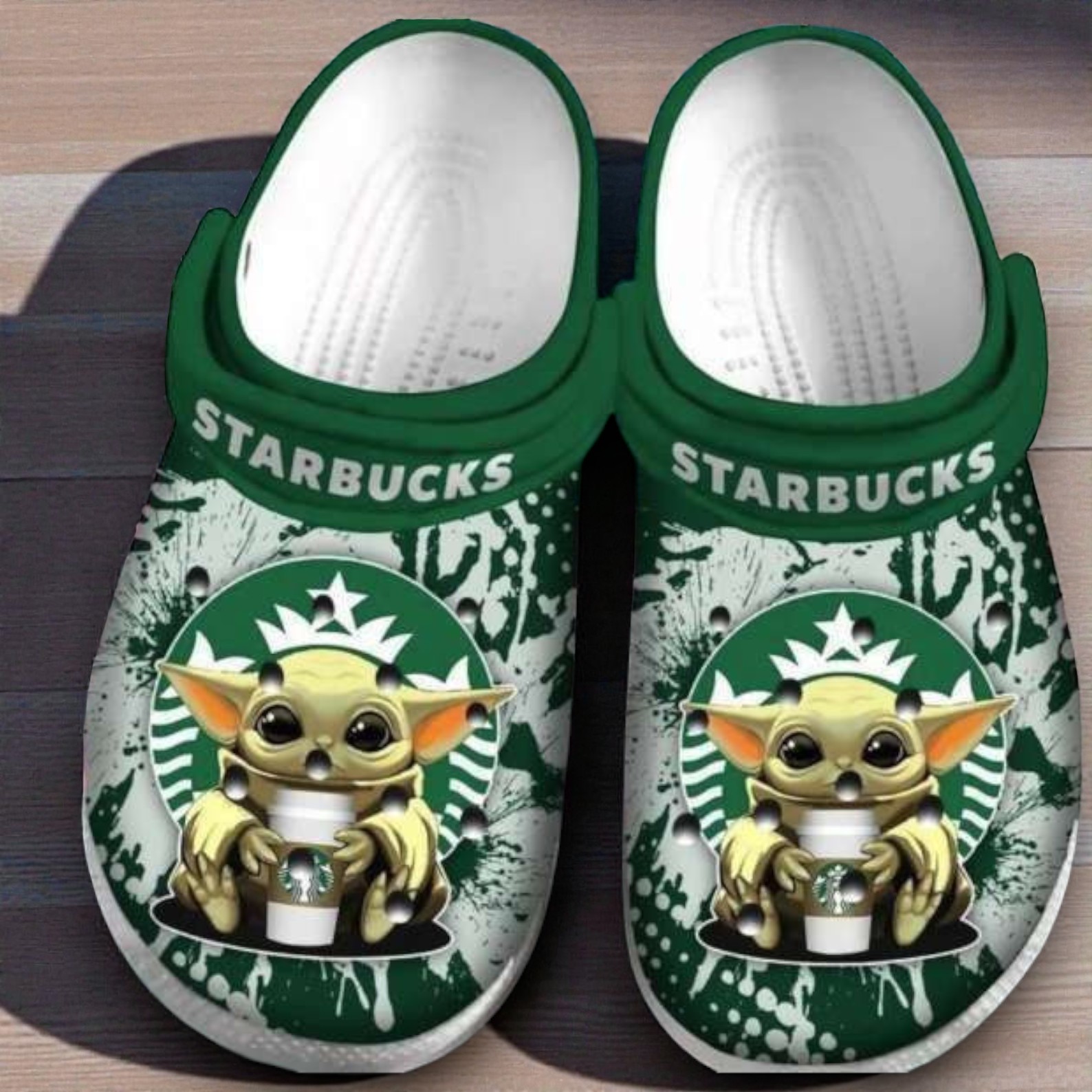 If you can't start your day without a coffee run, you need these. We've mashed up the galaxy's cutest alien with your favorite coffee brand. The design features Grogu holding a frappe cup, set against a cool green and white splash pattern. It’s the perfect mix of "don't talk to me yet" and "look how cute my shoes are."