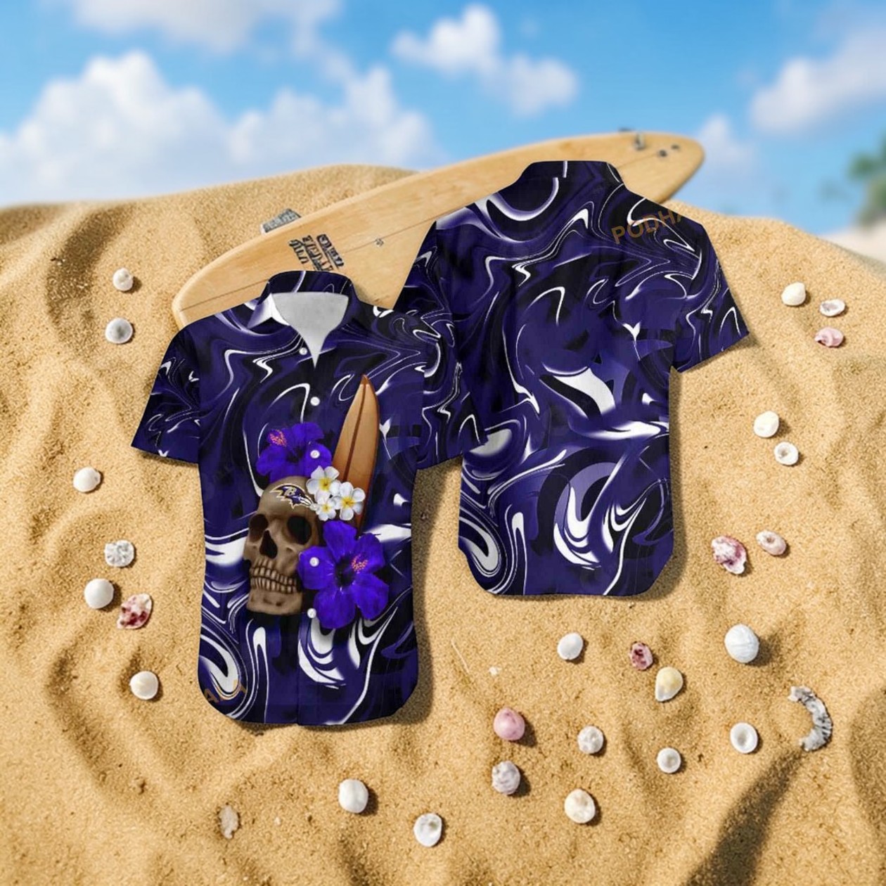 Baltimore Ravens Skull And Hibiscus Flower NFL Gift For Fan Hawaii Shirt, Baltimore Ravens Merch
