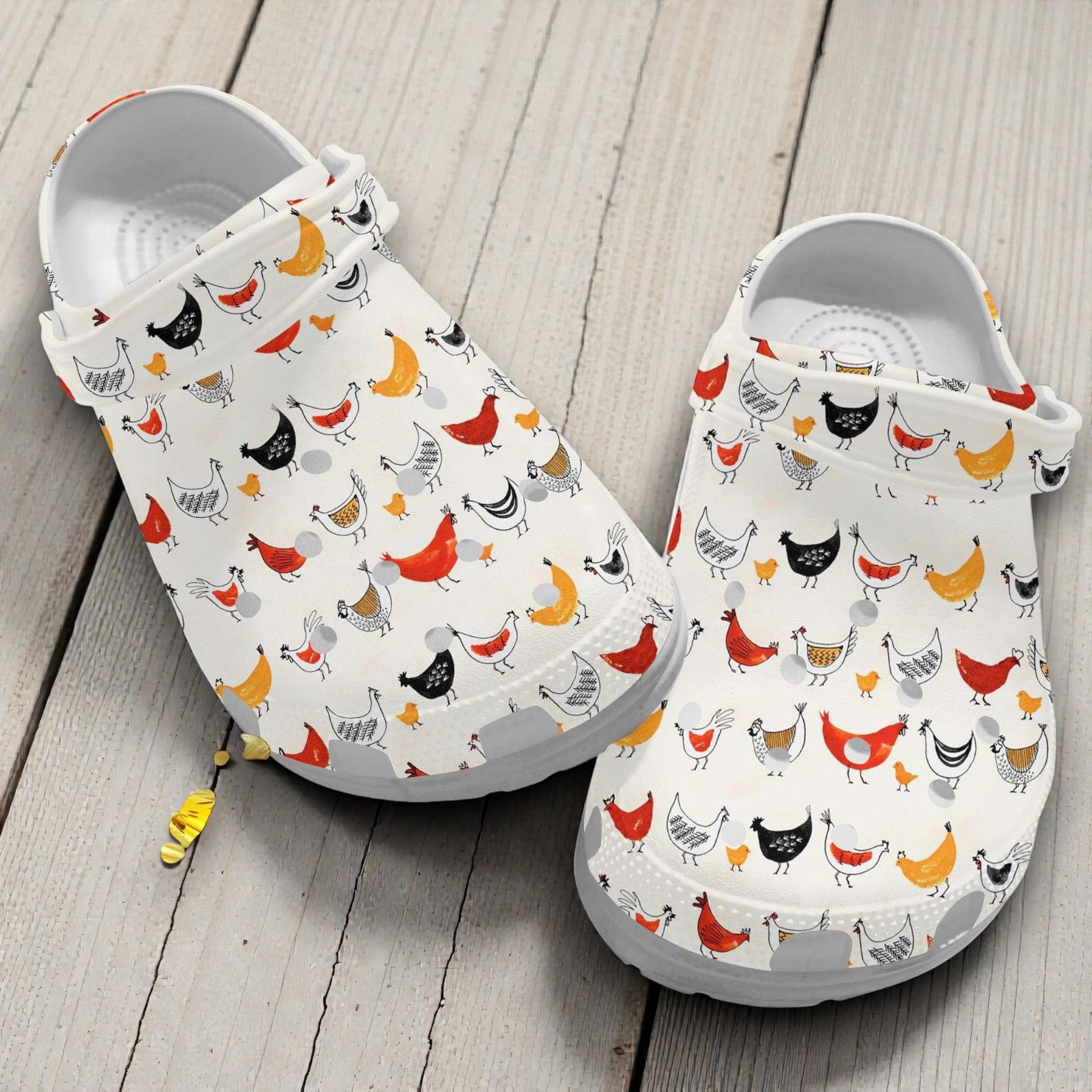 These custom Crocs feature a delightful, hand-drawn style print that celebrates the charm of the farm. Set against a clean white background, the design showcases a scattered pattern of stylized hens and roosters in rustic shades of mustard yellow, barn red, and bold black.