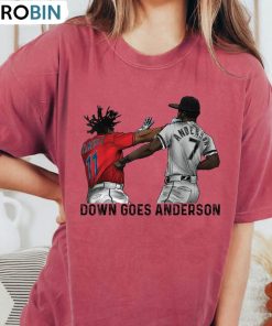 The Baseball Fighting Shirt Down Goes Anderson Crewneck Sweatshirt is a stylish and comfortable piece of clothing that is perfect for any baseball enthusiast. Made with high-quality materials, this crewneck sweatshirt features a unique design inspired by the sport of baseball. It showcases a graphic of a baseball player throwing a punch, with the words Down Goes Anderson emblazoned across the front. With its cozy fit and eye-catching design, this sweatshirt is sure to be a hit both on and off the field.