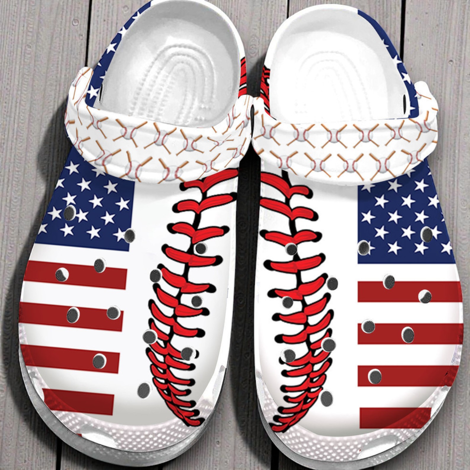 The design is clean and classic: one half features the US flag pattern, and the other mimics the white leather and red laces of a baseball. The heel strap even has a matching baseball stitch pattern, tying the whole look together. It is the perfect way to show your team spirit at the ballpark or just watching from home.