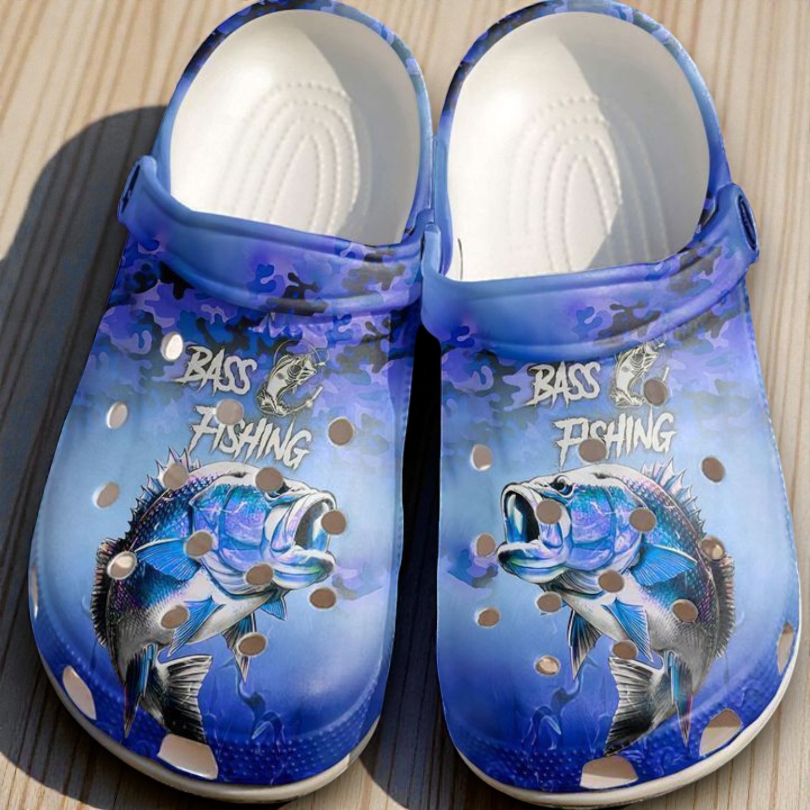The design features a stylish blue and purple camouflage pattern that gives the shoe a modern, "water camo" look. The main focus is a large, detailed illustration of a Bass jumping right out of the water, with the words "Bass Fishing" in a rugged font above it. It’s a bold look that fits perfectly on the boat or on the shore.