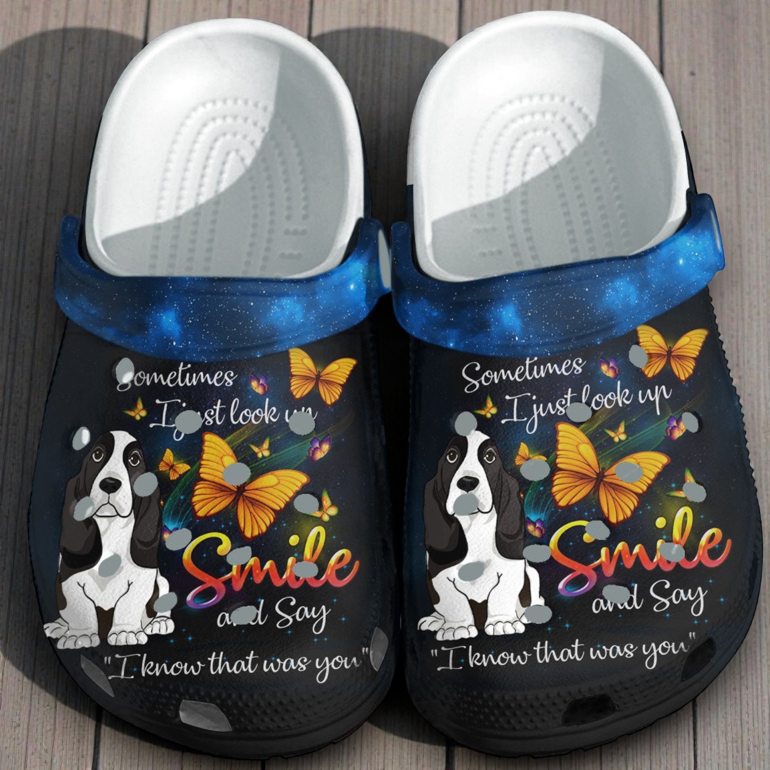 The design features a sweet Basset Hound looking up, surrounded by glowing yellow butterflies against a dark, starry background. The blue galaxy strap adds a dreamy touch, but the heart of this shoe is the quote: "Sometimes I just look up, smile and say 'I know that was you'." It is a comforting reminder that love never really leaves.