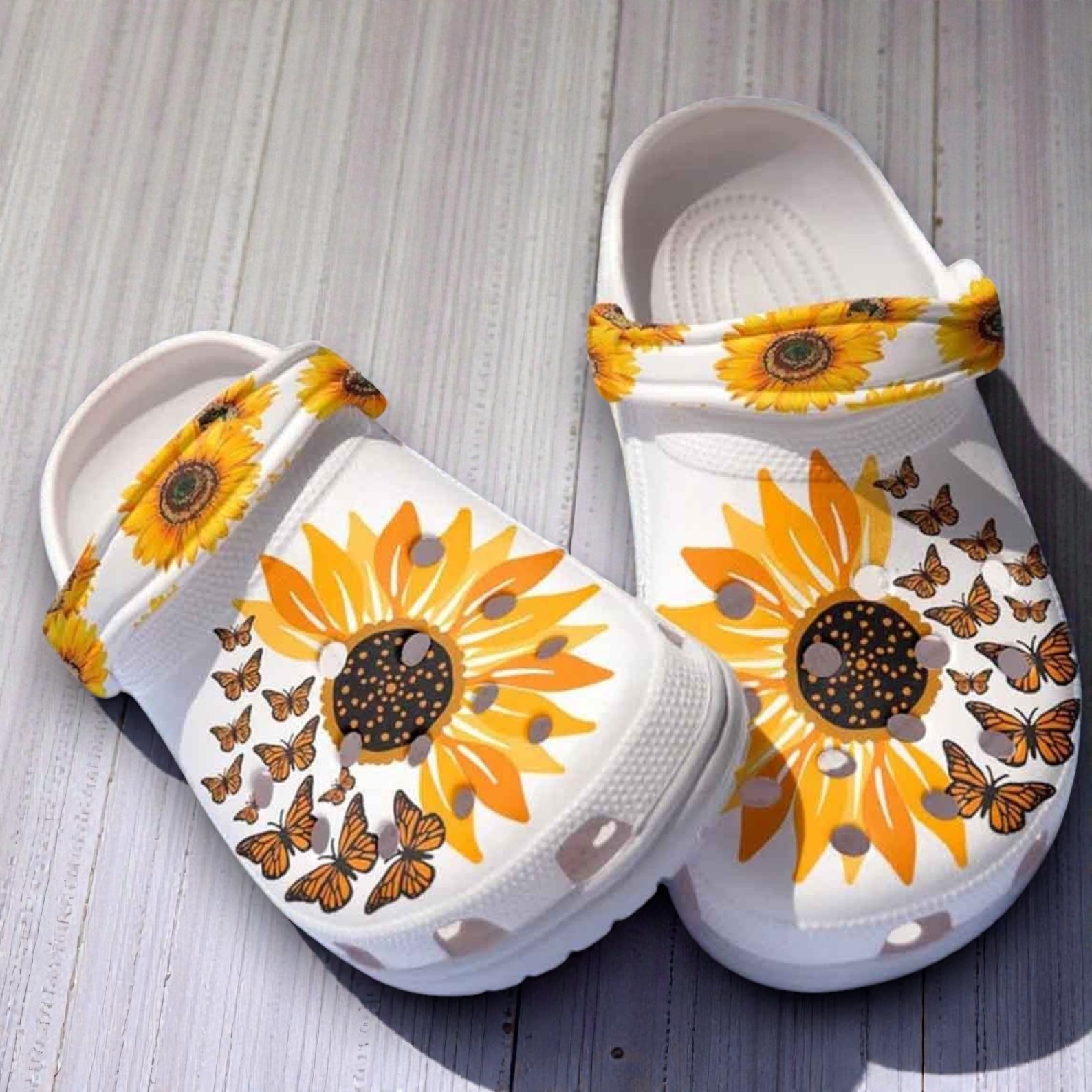 The design features large, vibrant sunflowers surrounded by fluttering monarch butterflies on a clean white background. Even the strap is detailed with matching sunflowers, giving the whole shoe a fresh, summery look. Whether you are gardening, heading to the beach, or just running errands, these are a fun way to add some color to your day.