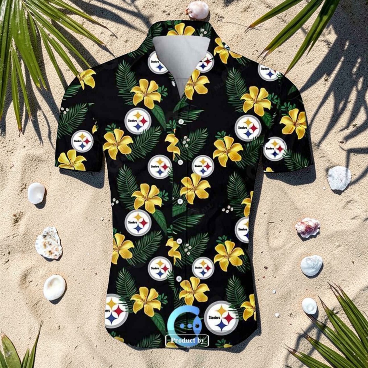 A black backdrop sets the stage for bursts of yellow hibiscus flowers and lush green palm leaves, weaving in the unmistakable Steelers logo like bright suns amidst the tropical flora. This isn’t just a shirt; it’s a stride in identity, blending weekend getaway vibes with the grit and passion of Pittsburgh football. The bold contrasts mirror the fierce energy of the Steelers’ game day spirit, merging island ease with hometown pride in a way that feels natural, not forced. For someone who carries their Steelers fandom beyond the stadium, who wears their team colors with a wink and a nod toward sun-soaked beaches or backyard barbecues, this shirt speaks loudly. It’s for the fan who isn’t just about the sport but embraces a lifestyle where loyalty and leisure collide. The tropical sports tribute shows off a playful, confident attitude—perfect for those who want their support to come with a side of laid-back, sunny energy. Whether worn poolside or while cheering from the couch, the Pittsburgh Steelers Hawaiian shirt connects two worlds. It holds meaning for those who appreciate bold style choices rooted in personal and cultural identity—fans who know it’s not only about the game, but about how the game lives within their daily rhythm. This is a piece that honors that blend without trying too hard, a nod to shared passion wrapped in vibrant, casual flair.