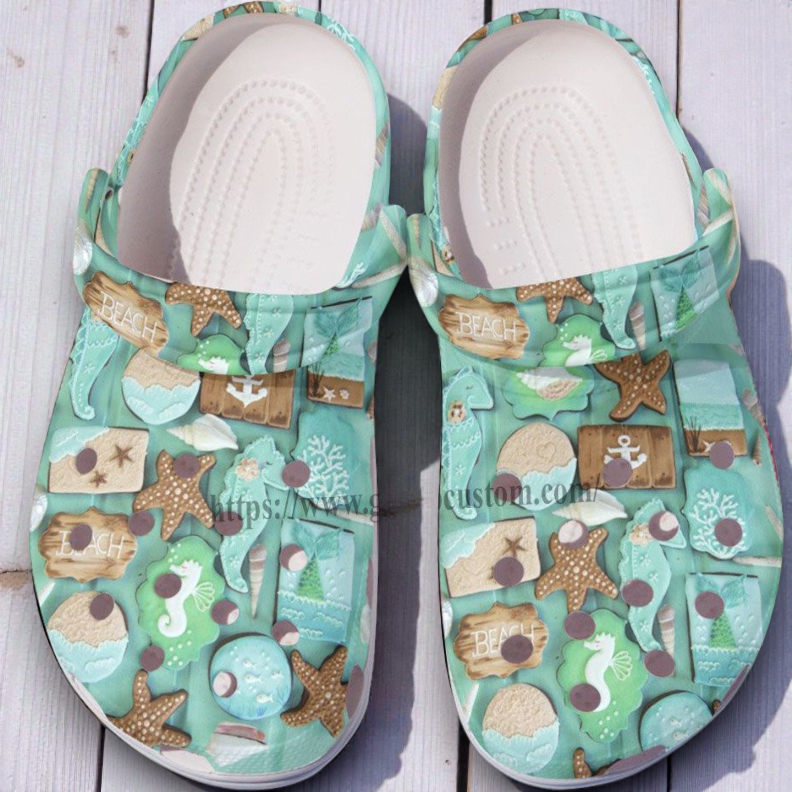 If you are already counting down the days until your next beach trip or just love that relaxed, coastal vibe, these are for you. We covered these mint green Crocs in a highly detailed pattern of decorated beach sugar cookies. You can easily spot frosted starfish, seahorses, seashells, and rustic wooden "BEACH" signs all over them. It’s a sweet, unique design that definitely gets people asking where you found them.