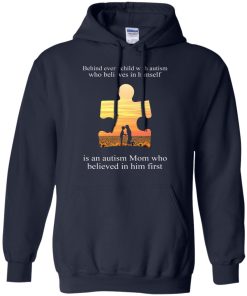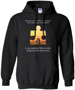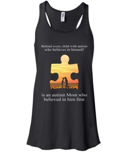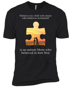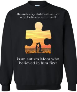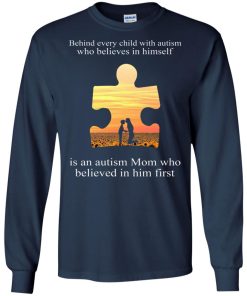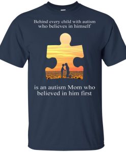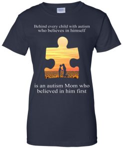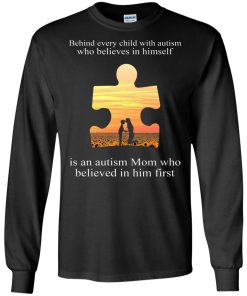 Behind every child with autism who believes in himself is an autism mom who believe in him first t shirt, tank top, long sleeve, hoodie