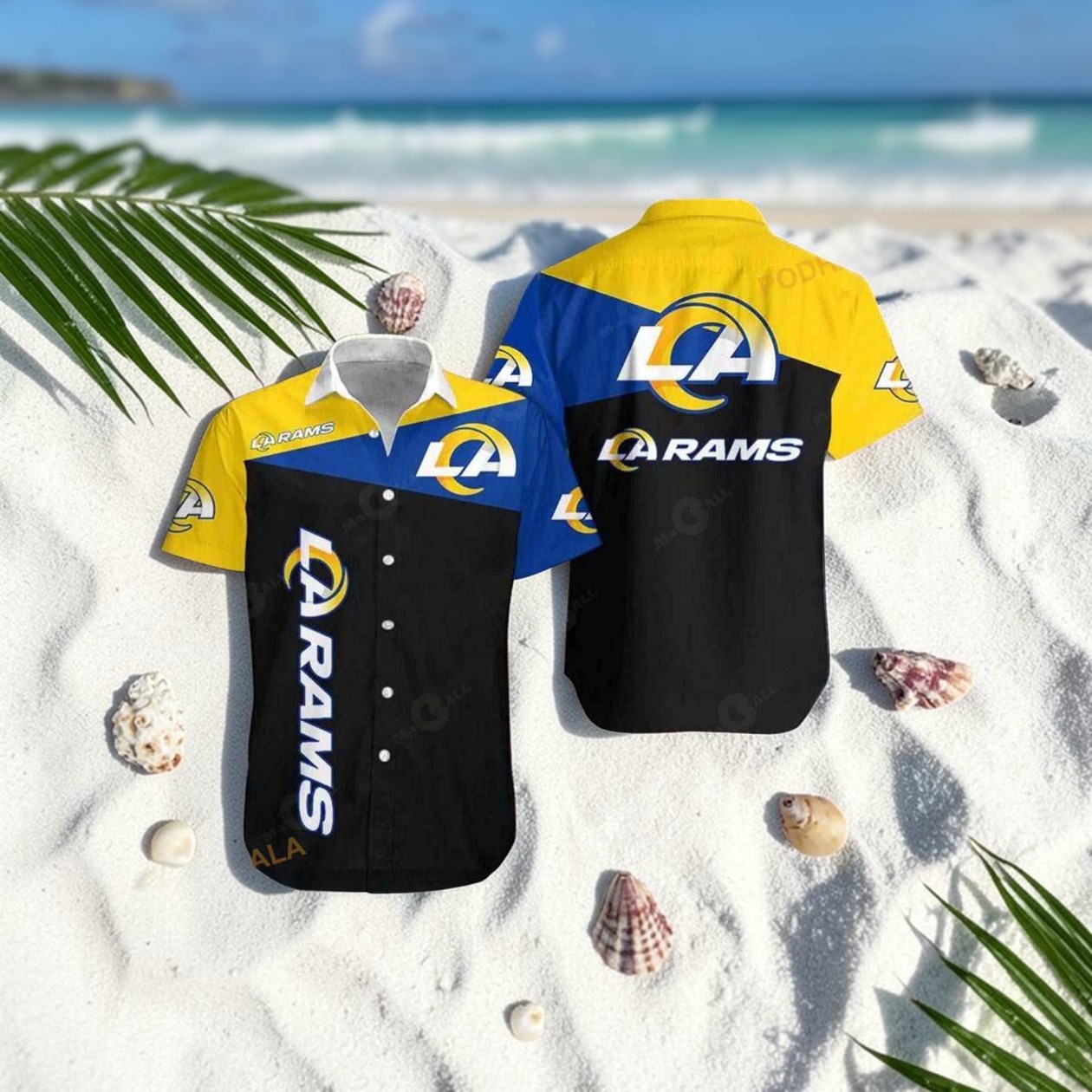 if you’re a Los Angeles Rams fan or know someone who’s super into the team, this Hawaiian shirt is honestly a fun way to show that off without going full jersey all the time. The design is pretty eye-catching—it’s got those bold yellow, blue, and black blocks that really pop and shout Rams pride. The logo is front and center, both on the chest and the back, so there’s no doubt which team you’re rooting for. It kind of has this retro athletic vibe but with a tropical twist, which makes it feel unique and a bit playful compared to your usual fan gear. I think this would be a cool thing for anyone who likes to mix up their game day look or just want something casual that still reps the team well. It’s not just for hardcore fans either; even sports enthusiasts who enjoy collecting interesting team apparel would appreciate the bold style and the way it stands out. Plus, it feels like the kind of shirt you could wear to a tailgate, a casual hangout with other fans, or even on a vacation if you want to keep showing your Rams love. Also, if you’re thinking about gifts, this would be a smart pick around football season or for someone who’s got a collection of Rams memorabilia but needs something less conventional and a bit more fun. It’s got that fan energy but in a shirt form that’s comfortable and stylish without looking like typical fan merchandise. Definitely something to keep in mind if you want to mix things up with your Rams gear.