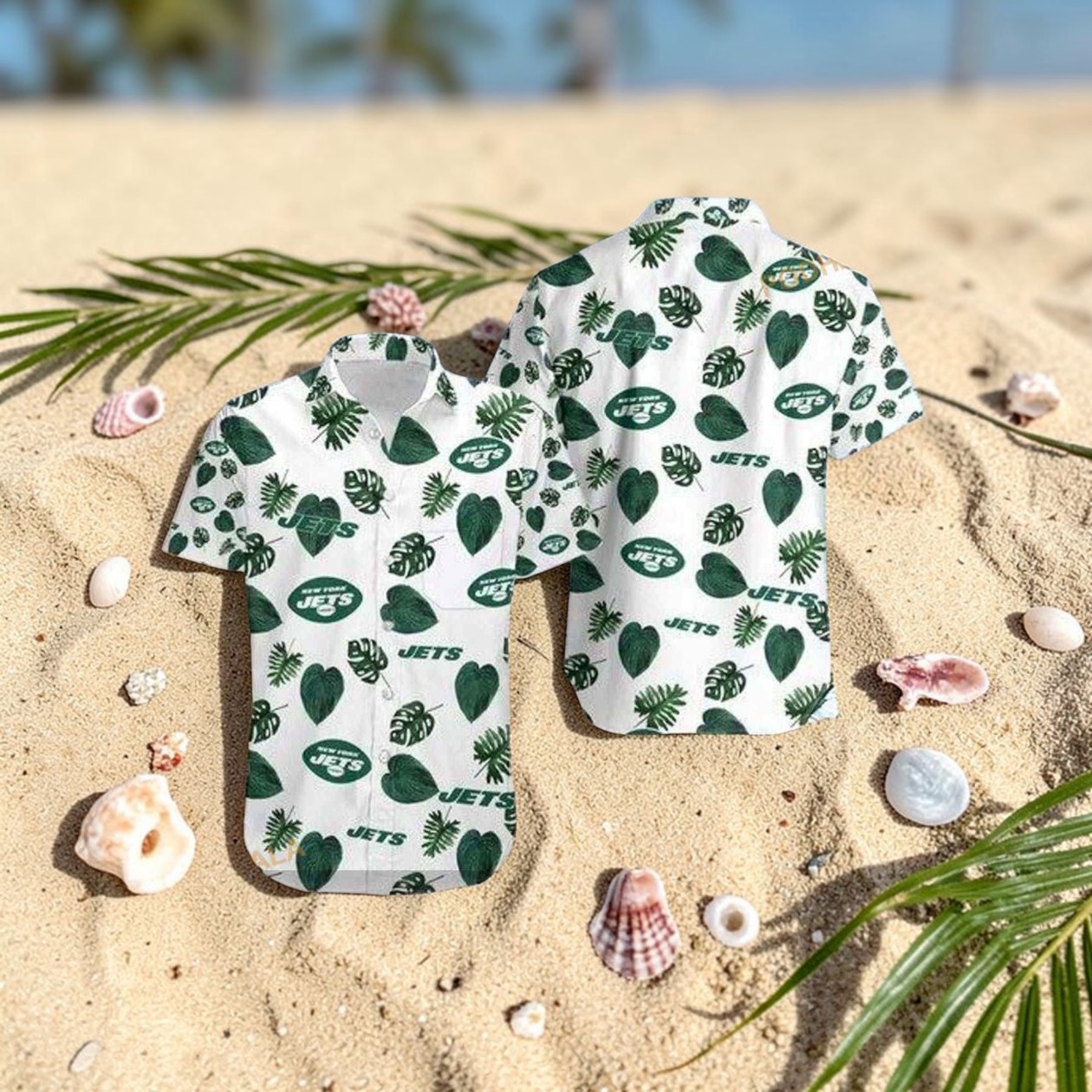 Bright green palm leaves sprawl across the fabric, weaving in and out of scattered Jets logos and leafy hearts in a lively pattern. The bold JETs text appears here and there, blending into the tropical foliage with a casual flair that is far from forced. There’s an easygoing energy to the shirt, the kind of vibe that captures the spirit of game day tailgates under the sun or laid-back beach afternoons spent with fellow fans. The design feels like a nod to those who carry their Jets pride beyond just the stadium, mixing fandom with a taste for relaxed, vacation-ready style. It’s not just about flags and jerseys—it’s about integrating that allegiance into everyday moments that call for something lighter and more festive. For someone who lives for the shared buzz of Jets culture but also enjoys a sense of ease in their wardrobe, this shirt fits naturally. This is the kind of gift that lands well when you want to bring a subtle but heartfelt connection to a friend’s summer plans or game day rituals. Those who know the Jets and appreciate a bit of playful, seasonal flair will find it a comfortable way to show loyalty without the formality of traditional fan gear. The New York Jets Hawaiian shirt quietly strikes a balance between spirited devotion and spirited style.