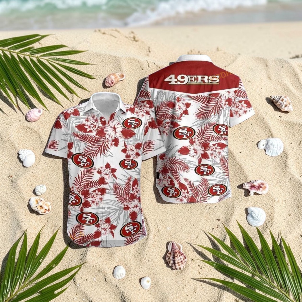The first thing that catches the eye is the vibrant mix of red and white floral patterns set against a tropical backdrop, creating a lively and energetic feel. Scattered across the shirt are circular patches featuring the 49ers logo, adding precise nods to the team without overwhelming the design. On the back yoke, bold “49ERS” lettering in a collegiate sans serif font stands out clearly, emphasizing allegiance with unmistakable pride. This shirt goes beyond casual fan gear by blending the unmistakable spirit of a tropical print with the identity of a dedicated San Francisco 49ers supporter. It’s the kind of piece that reflects someone who enjoys showing team loyalty in a relaxed and festive way, not just on game day but also during get-togethers or outdoor events. The retro vibe complements a confident, upbeat personality—someone who can appreciate both style and sports culture without sacrificing comfort. Ideal for fans who want something a bit different from the usual jerseys or hoodies, it’s well suited for warmer days, tailgate parties, or even traveler wardrobes heading to sunny locales. As a gift, this San Francisco 49ers Hawaiian shirt stands out as a thoughtful choice for anyone who loves merging sport fandom with a relaxed, playful aesthetic.