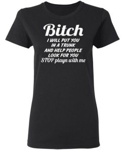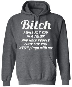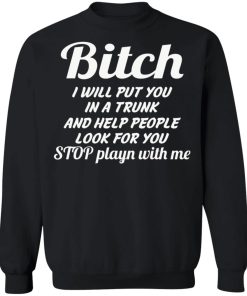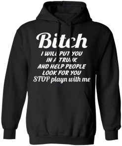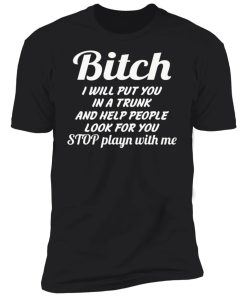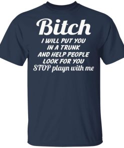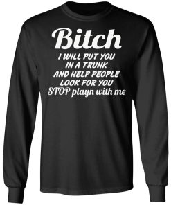 Bitch I Will Put You In A Trunk And Help People Look For You Stop Playn With Me shirt. Available in t shirt, long sleeve, tank top, hoodie, sweatshirt and multiple color. If you want in another color please contact us. Quality control before delivery. Print: Digital printing, colors won’t fade or peel. The design is printed with new age printing technology. It is printed with a water – soluble and eco – friendly ink. Treat yourself, or make this shirt the perfect gift on birthdays, anniversaries, holidays, or give a gift to friend, yourself, or family, or for no reason at all.