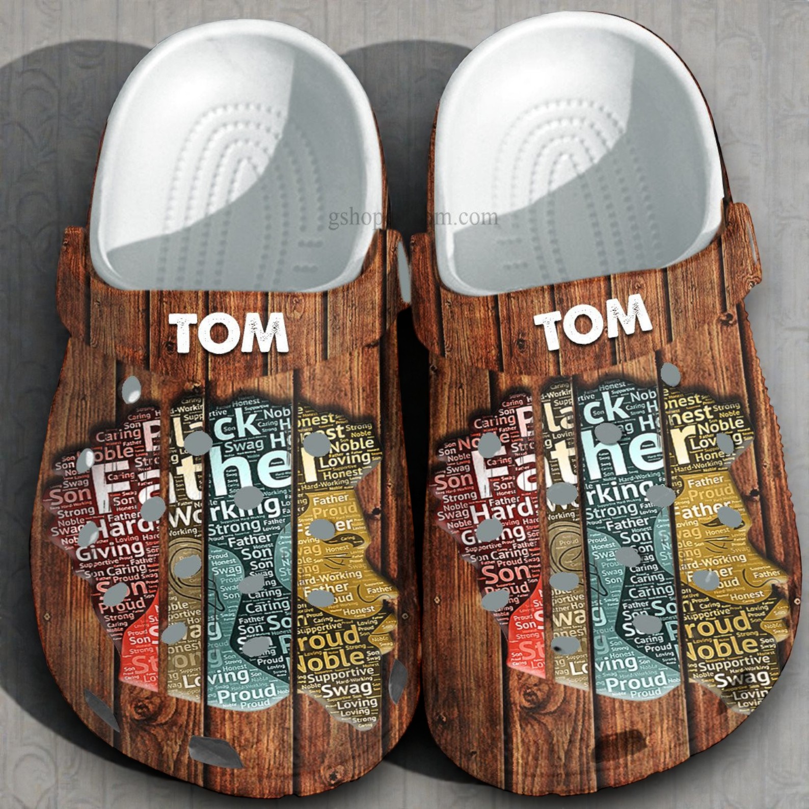 There’s something about these shoes that grabs your eye immediately—the blend of vintage wood texture with bold, colorful typography is just unexpected in a pair of slip-ons. At first glance, the wood plank background feels warm and rustic, like a nod to timeless craftsmanship. But then your attention moves to the strap where a white uppercase name boldly stands out, personalized just for the wearer. Around it, a lively word cloud spills vertically in vibrant bars, mixing sizes and weights that bring some playful energy to the design. The perforated holes and cut-out hearts add subtle details that break up the solidity, making the design both rugged and approachable. It’s a style that feels masculine but personal, lending itself perfectly to someone who appreciates vintage vibes without losing a bit of modern flair. This is the kind of shoe a dad or grandpa who takes pride in his roots—maybe even his “king” status in the family—would get a kick out of wearing. These aren’t just shoes for everyday errands; they’re made for family gatherings, casual afternoons on the porch, or those little moments when you just want to kick back and feel a connection to the people who matter most. Whether you’re shopping for Father’s Day or a birthday, these black father vintage crocs shoes gift grandpa father day dad black king retro wood shoes customize with the customizable name adds a thoughtful, one-of-a-kind touch. It’s a simple way to celebrate personality, family pride, and style that stands apart from the usual.