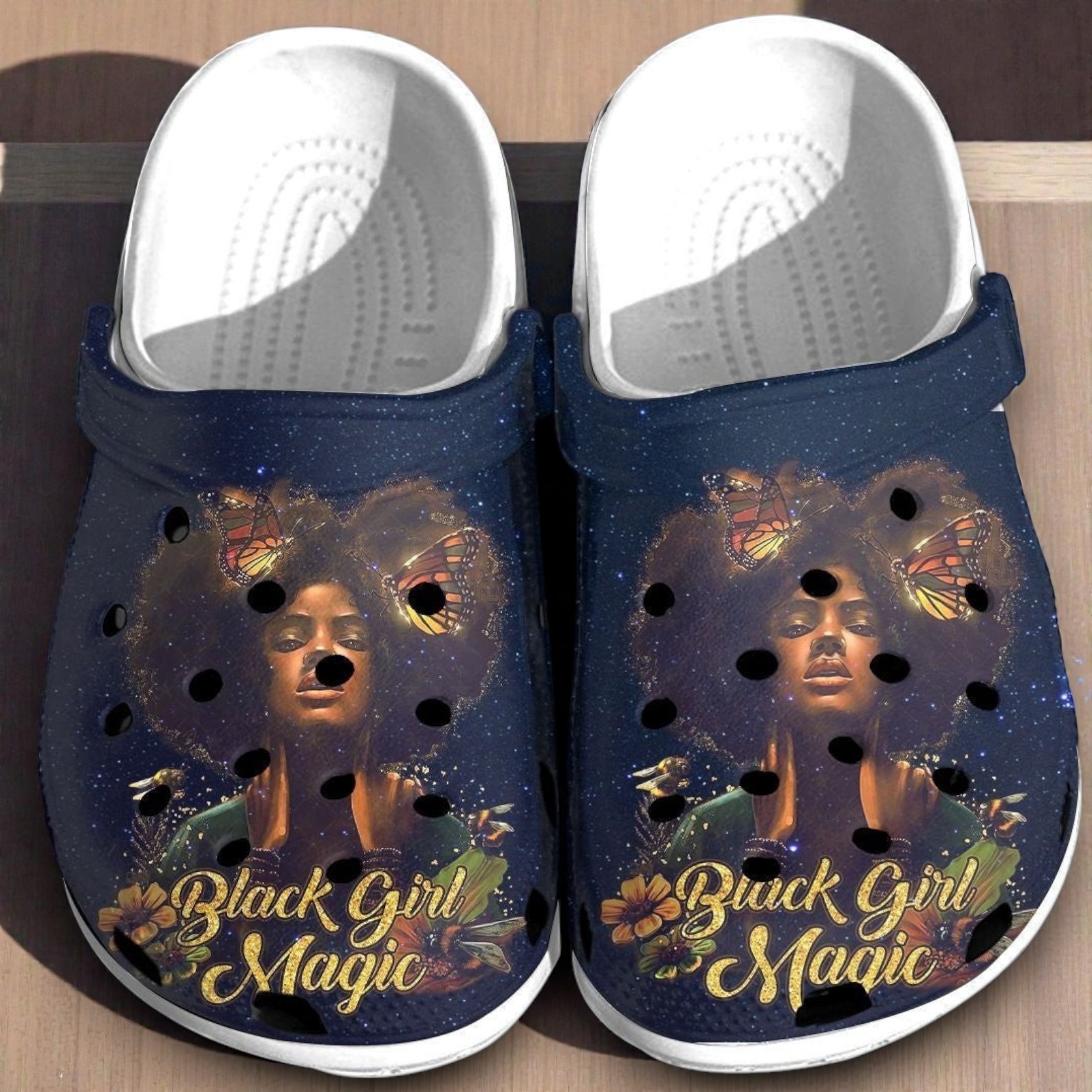 A bold silhouette of a Black woman with a full, proud afro anchors the design, her gaze steady beneath a scatter of fluttering butterflies and delicate floral accents. Behind her, a night sky dotted with stars wraps the scene in quiet strength, while the flowing script of “Black Girl Magic” arcs effortlessly above, casting an air of empowerment and celebration. These clog sandals speak directly to the soul of anyone who embraces the beauty and power of Black identity, blending artistry with a message that carries both pride and resilience. For those who find joy in wearing their spirit on their feet, these shoes aren't just about style—they’re a statement. Whether worn around the neighborhood or gathered at a friends’ weekend, they add an artistic flair that feels personal rather than performative. Someone drawn to uplifting designs that echo their lived experience would see these clogs as a meaningful extension of self-expression. And when it comes to gifting, they resonate as a thoughtful nod to a loved one’s strength and uniqueness, the kind of present that lands softly but leaves a lasting impression. In every detail—from the striking portrait to the subtle shimmer of stars—there’s a genuine honoring of Black Girl Magic that feels as natural as it is inspiring, a wearable reminder of power that belongs in everyday moments.