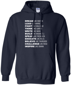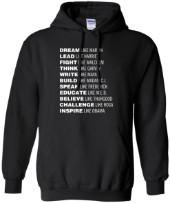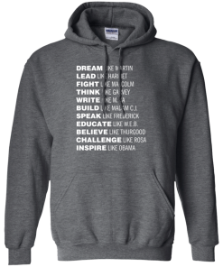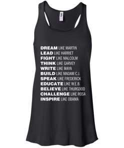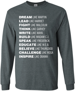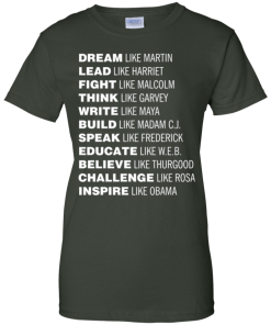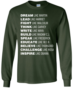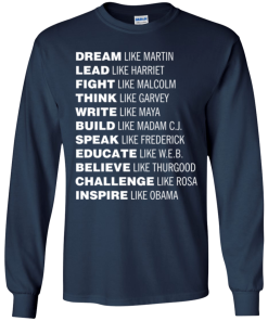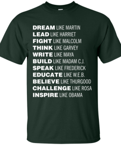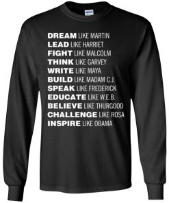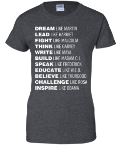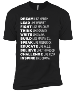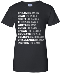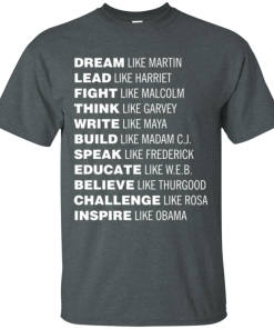 Black Lives Matter Shirt: Dream Like Martin, Lead Like Harriet, Fight Like Malcolm, Think Like Garvey, Write Like Maya, Build Like Madam C.J, Speak Like Prederick, Educate Like W.E.B, Believe Like Thurgood, Challenge Like Rosa, Inspire Like Obama.