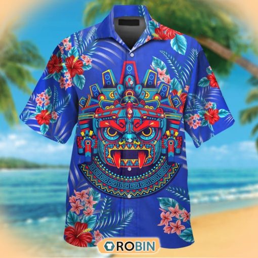 Blue Aztec Tlaloc God Mexican Mural Art Hawaiian Shirt features