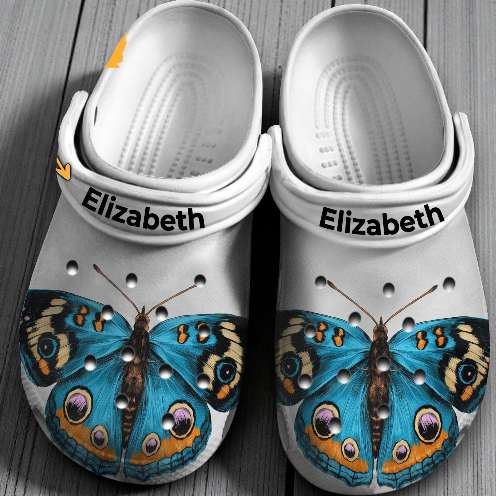 Simple, elegant, and made just for you. These white Crocs feature a stunning, detailed blue butterfly spreading its wings across the front.