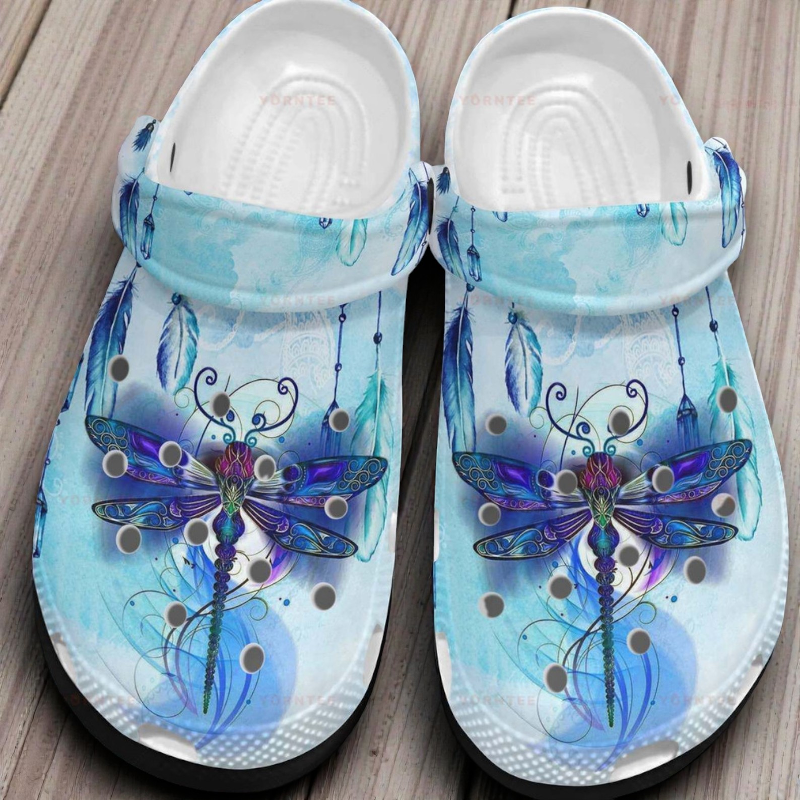 Add a peaceful touch to your day with these custom Dragonfly Crocs. The design features a beautiful, detailed dragonfly with jewel-toned wings, set against a soft blue watercolor background. The look is finished with subtle feather accents, giving the shoes a relaxed, bohemian feel.
