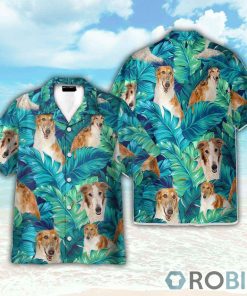 Borzoi In Tropical Green Leaves Hawaiian Shirt features