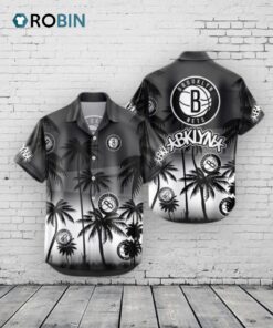 Rep your team with tropical vibes! This black Hawaiian shirt features a subtle Nets logo amidst swaying coconut trees. Perfect for summer BBQs, game nights, or just chilling. Show your borough pride in a relaxed style. Get yours today!