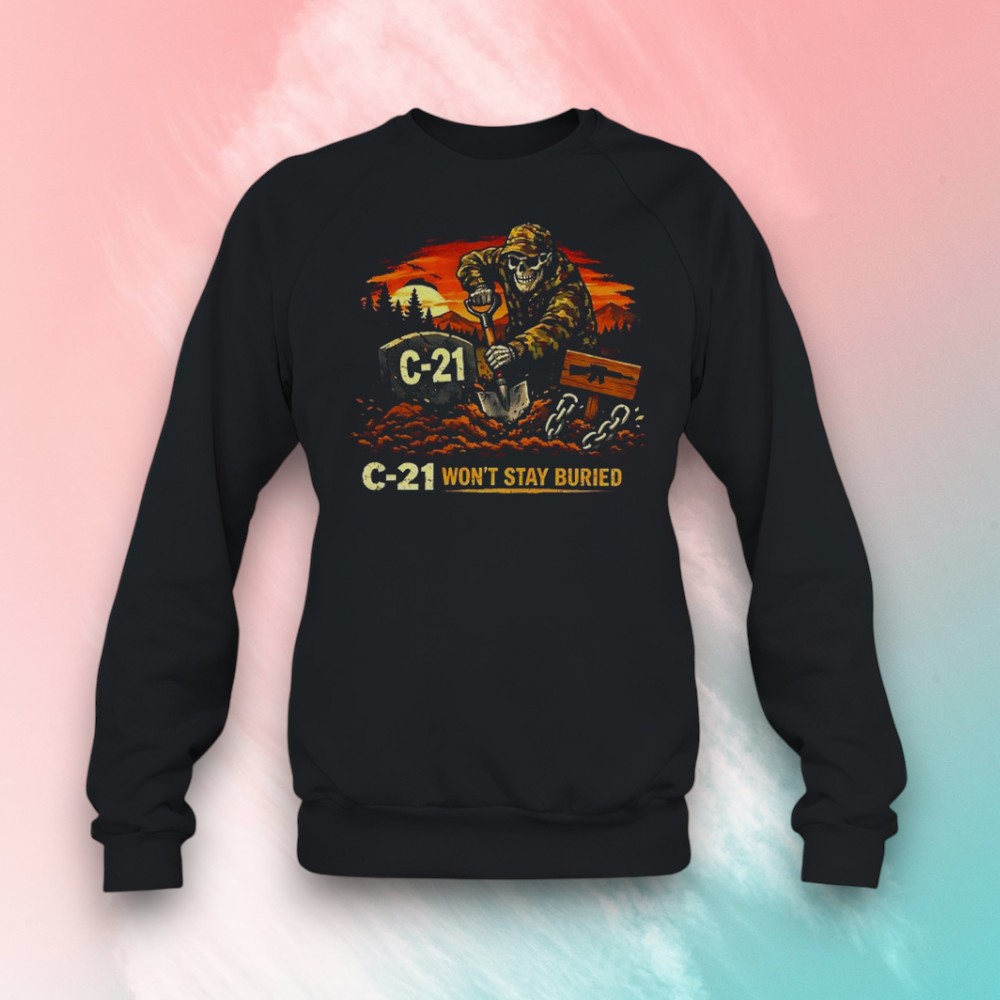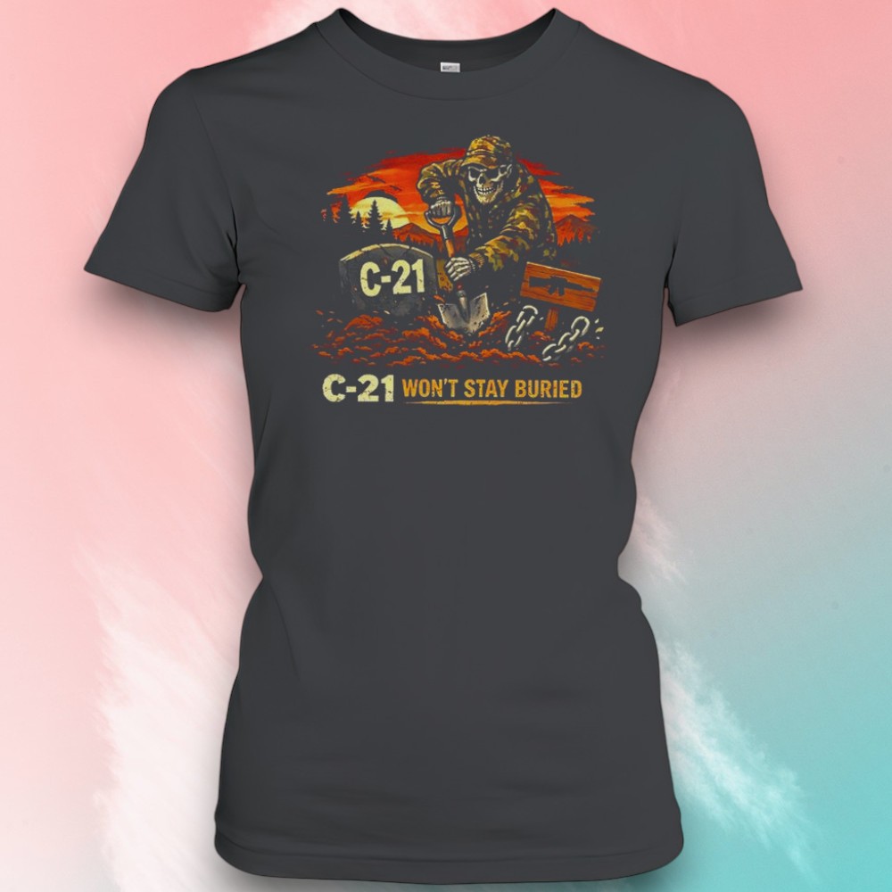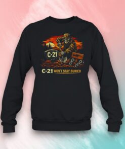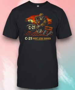 A grinning skeleton chisels its place in the dirt beneath a fiery orange sky, chains rattling as it digs a grave marked with “C-21.” The bold retro illustration feels like a darkly playful nod to undead mining lore, blending vintage distress with a rebellious, metal edge. Blocky, high-contrast typography anchors the design, making the image pop against the shirt without overwhelming it. The whole vibe walks the line between grim humor and unapologetic attitude. It’s the kind of t-shirt that fits effortlessly into a weekend filled with late-night horror movie marathons or casual hangouts where dark humor takes center stage. Pair it with worn denim and boots for a look that feels raw and unapologetic—no need to dial it down. Wearing this is a quiet shout-out to anyone who loves graphic tees that don’t just fill space but carry a story and a mood. The C-21 won’t stay buried shirt isn’t for the faint of heart; it’s for those who embrace a bit of defiance and relish a touch of the macabre in their daily style. This shirt naturally fits into a wardrobe where music, mischief, and a love for the oddly entertaining intertwine. It’s a piece friends or family who appreciate a darker twist on humor might find themselves drawn to, especially if their conversations often orbit horror, Halloween, or the gritty charm of undead motifs. It’s less just a graphic tee and more a nod to a uniquely edgy lifestyle.