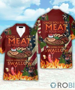 The Camping Bear Put My Meat Want To Swallow Hawaiian Shirt is a fun and vibrant shirt that captures the spirit of camping. The design features a bear enjoying the great outdoors, surrounded by camping essentials such as a tent, campfire, and trees. The colorful hibiscus flowers and tropical leaves add a Hawaiian touch, making it the perfect shirt to wear during a Camping trip in paradise. The intricate details and bright colors make this shirt a standout choice for outdoor enthusiasts and nature lovers.