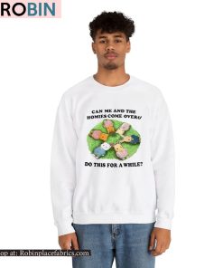 The shirt Can Me And The Homies Come Over And Do This For A While is a fun and casual piece of clothing that is perfect for hanging out with friends. It features a quirky and humorous message that is sure to spark laughter and conversation. The design is simple and stylish, making it a great choice for a relaxed and laid-back gathering with your buddies. The shirt is made of high-quality material, ensuring comfort and durability while you spend time with your friends.