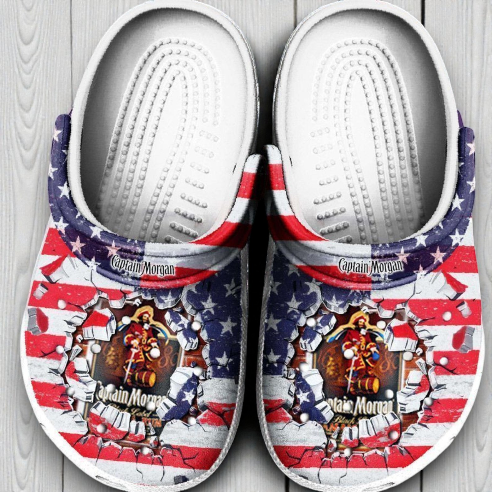 These Captain Morgan American Flag Crocs combine the classic comfort of Crocs with a bold, patriotic design featuring the iconic Captain Morgan pirate. The clogs are white with a full American flag print across the uppers, and the legendary Captain Morgan figure bursts through the center in his signature pose—sword in one hand, foot planted on a barrel, hat tilted just right. The Captain Morgan logo appears on both heel straps and below the graphic for an authentic touch.