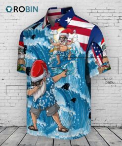 Cowabunga, Panthers fans! 🤙 Get ready for some festive fun with this awesome Hawaiian shirt. Surfing Santa's traded snow for sun, decked out in team colors. Perfect for holiday parties or showing your Panther pride in paradise! Might be cooler than the carolina panthers new uniforms.
