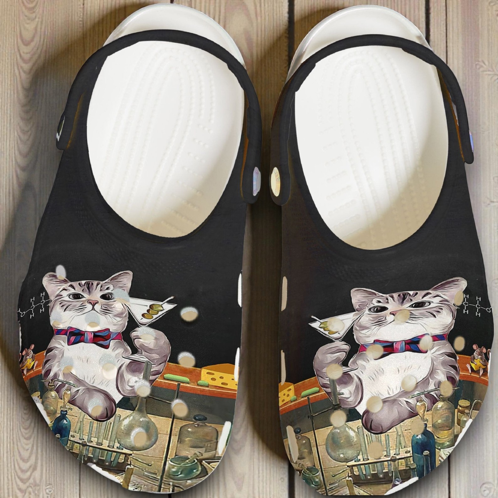 These black Crocs feature a surreal, vintage-inspired illustration of a "Mad Scientist Cat" that leans into a dark academia aesthetic. Set in a laboratory filled with bubbling flasks and chemical formulas, this tabby cat—complete with a bowtie—trades a petri dish for a martini glass, making these the ultimate choice for science enthusiasts with a dry sense of humor.