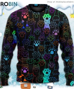 Get into the festive spirit with this adorable and charming Christmas sweater sweatshirt. Made with the softest materials, it is perfect for cuddling up with your pet or lounging around during the holiday season. The design features a cute little paw print in the center, adding a touch of whimsy to your outfit. The sweater also boasts a vibrant assortment of holiday colors, such as red, green, and white, making it the perfect addition to your winter wardrobe. Stay warm and stylish this Christmas with this festive and cozy sweater sweatshirt.
