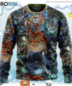 This unique and eye-catching sweater is perfect for any cat lover looking to show off their festive spirit. Featuring a colorful cat glass art design, this sweater is sure to be a conversation starter at any Christmas party or gathering. With its ugly sweater style, it adds a fun and playful touch to any holiday outfit. Made from comfortable and soft materials, this sweater is not only fashionable but also cozy. Whether you’re celebrating the holiday season or simply showing off your love for cats, this sweater is a must-have for any cat enthusiast.