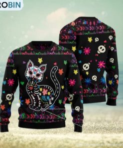 Cat Sugar Skull Floral Pattern Ugly Christmas 3D Sweater details