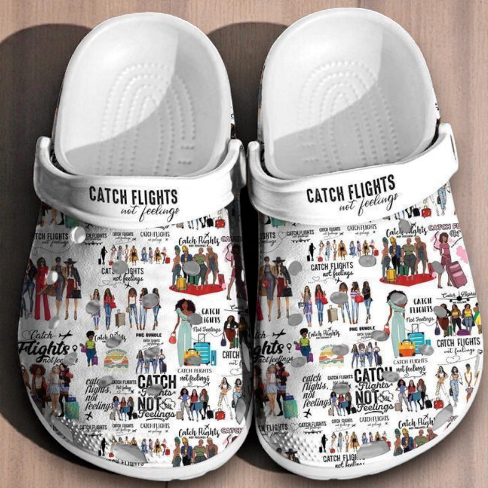 The iconic mantra "CATCH FLIGHTS not feelings" is boldly printed on the heel strap and woven throughout the design, setting the vibe for your next adventure. Whether you are heading on a girls' trip, navigating a busy terminal, or just dreaming of your next stamp in your passport, these shoes deliver first-class comfort and style.