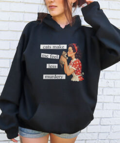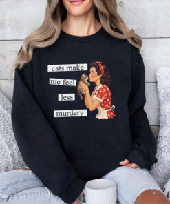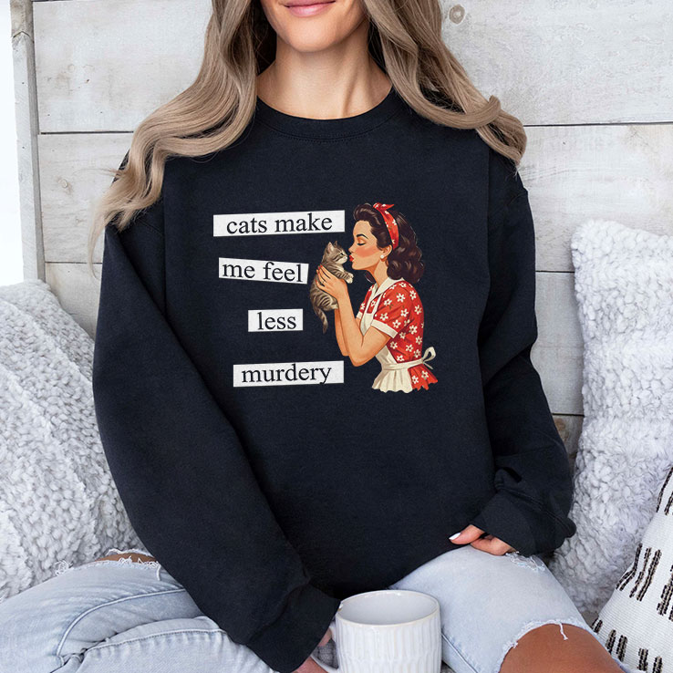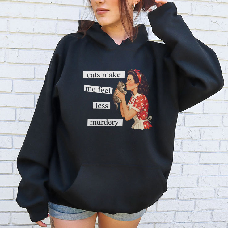 This dark-humor cat graphic nails that exact mood with the line “cats make me feel less murdery” and a retro-style illustration that’s equal parts sweet and savage.