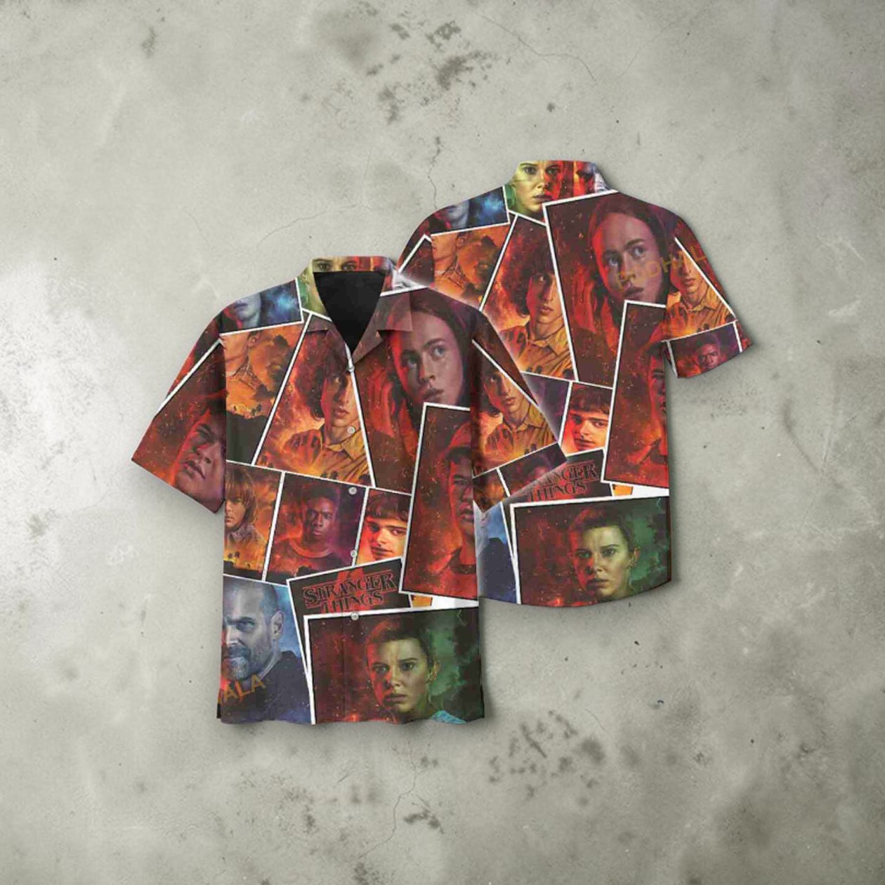 When the eerie glow of Hawkins meets the sun-drenched vibes of Hawaii, something unexpectedly electric happens. This Stranger Things 4 shirt collage captures that contrast perfectly with its sharp polaroid-style panels framing beloved characters in vivid reds and oranges. The white borders slice through the design like snapshots stolen from a retro horror film, inviting the wearer to carry a piece of Stranger Things lore wherever they go. It’s not just a shirt; it’s a statement about being part of a story that’s equal parts spooky and adventurous. The cinematic pop-art composition conveys a sense of nostalgia for the ’80s while embracing the wild new chapters that kept everyone talking through the latest season. This is the kind of gear someone who lives for deep dives into the Upside Down, late-night binge marathons, and Halloween nights that mix costume creativity with sheer fandom pride might pull on. Layered under a worn denim jacket or paired with casual jeans, it fits effortlessly into a wardrobe that’s all about comfort and personality. It appeals to those who want their style to reflect more than just fashion — it’s the subtle badge of belonging in a community fueled by pop culture obsession and a love for stories that blur the line between reality and the supernatural. For anyone who counts Stranger Things 4 shirt collage among their favorite visuals, it’s a piece that strikes a balance between nostalgia and fresh excitement, perfectly suited for casual wear or even as a standout conversation starter on Halloween.