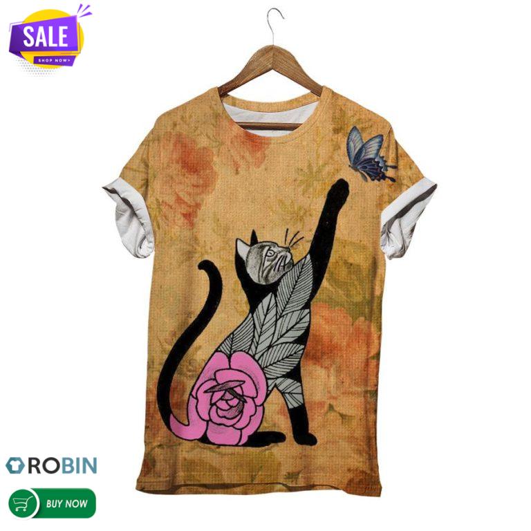 Chasing Butterfly Black Cat 3D All Over Print T-Shirt