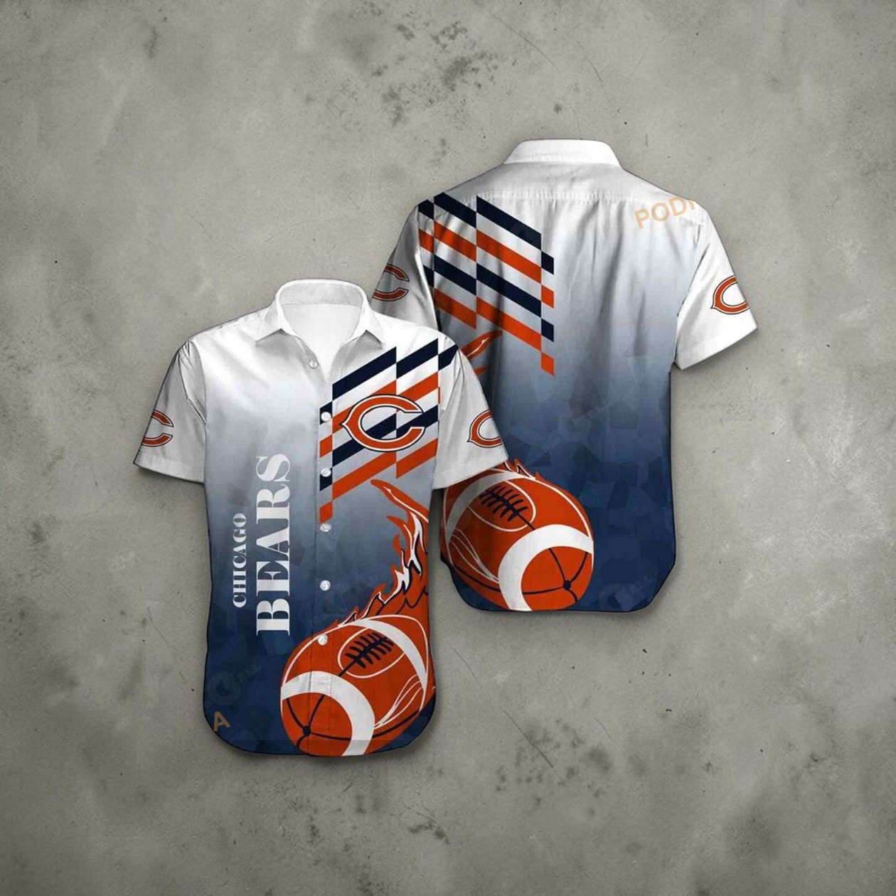Bold stripes of navy and orange slice through a gradient background that fades from crisp white to a deep midnight blue, creating a dynamic stage for the Chicago Bears logo and lively basketball motifs. The crisp geometry of diagonal lines contrasts sharply with the playful roundness of the hoops, balancing energy and structure. The team name appears in strong, condensed uppercase letters that pop against the broader shapes, reinforcing the athletic vibe without crowding the design. This shirt speaks to someone who wears their loyalty like a badge, not just on game day but anytime they want to tap into that electric feeling of fandom. It’s for the person who appreciates graphics that go beyond basic logos and embraces a bold aesthetic that carries the cheer and competitive spirit of the Bears, whether at casual meetups or weekend outings. The color interplay draws enough attention to spark conversations but stays true to the team’s classic palette—it doesn’t shout, it asserts. For Bears enthusiasts and sports fans who appreciate spirited, playful fashion, this shirt fits naturally into a wardrobe of authentic, everyday pieces. It’s less about making a loud statement and more about carrying the energy of the sport into daily moments—barbecue chats, city strolls, or laid-back gatherings where a meaningful graphic can express identity just as well as words. A genuine nod to Chicago pride, crafted with enough edge to stand out without overdoing it.
