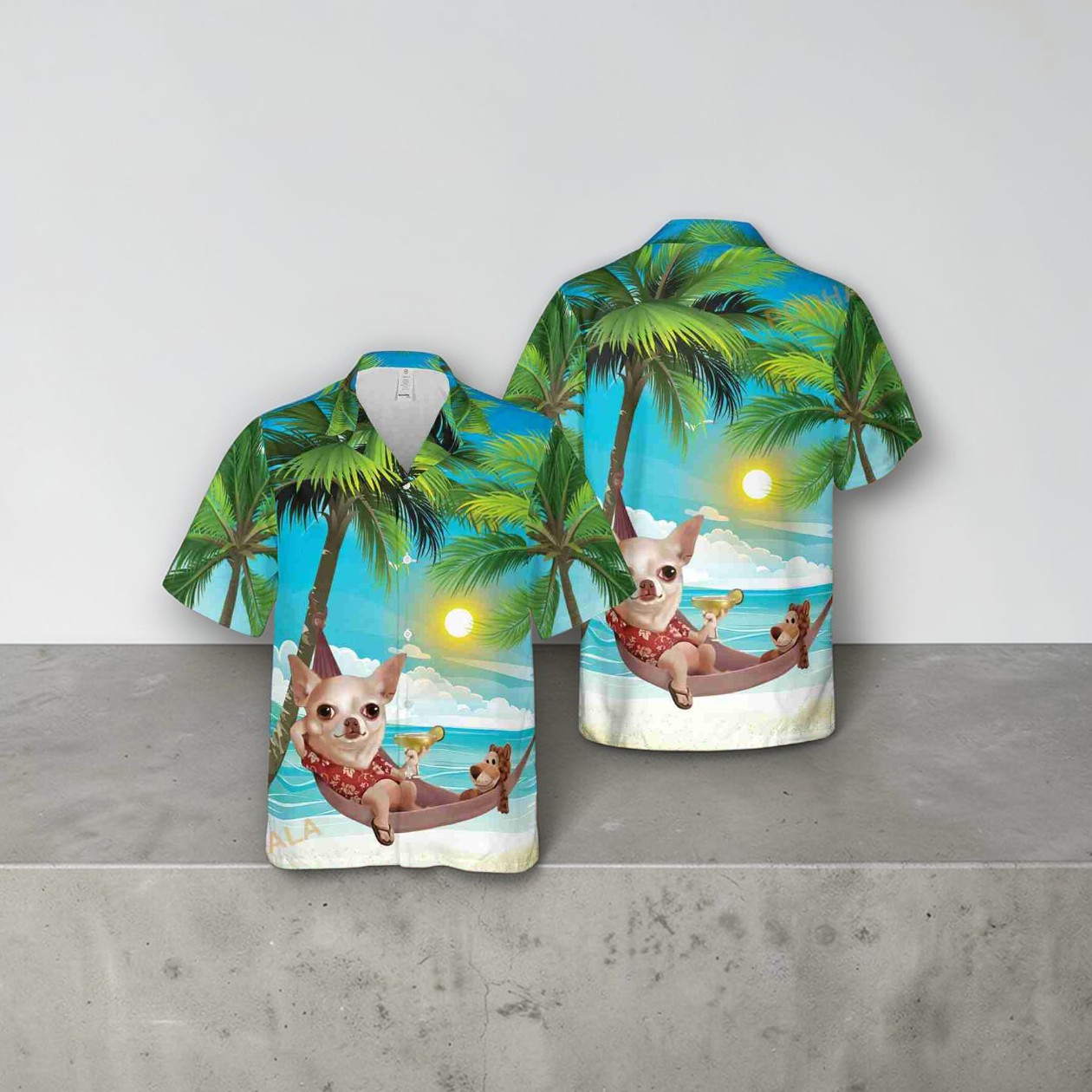 Palm trees swaying, the sun dipping just below the horizon, and a tiny chihuahua lounging in a hammock—this shirt captures a slice of that endlessly relaxed, beachside vibe. The composition plays with bright, tropical colors: the rich turquoise of the ocean contrasts with the warm oranges and pinks of the sunset sky. It’s playful without feeling childish, thanks to a smoothly illustrated cartoon style that brings the little dog’s laid-back attitude to life. The placement of the chihuahua, comfortably nestled amid palm fronds and fluffy clouds, feels just right—balanced and inviting, like a visual exhale. This is the kind of design that clicks with people who live for those moments when summer slows down and the small joys—like a dogdozing in the shade—take center stage. Chihuahua owners and dog lovers will appreciate how it elevates that quirky connection to their pets, while vacation enthusiasts might see it as a reminder of that perfect beach day they want to hold onto. It’s an easy, fun way to carry a piece of that sunny spirit beyond the shoreline, whether worn at casual get-togethers or weekend hangouts. In a world where everyone is chasing the next big thing, there’s a simple appeal here: a laid-back, lighthearted nod to a beloved dog and the timeless allure of the tropics. The chihuahua beach shirt slows down the pace, inviting you to join in on the easygoing scene.