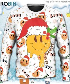 Get ready to spread some groovy holiday cheer with this vibrant and funky sweater! This unique holiday must-have features an eye-catching design that is sure to catch everyone’s attention. The Santa Claus smile face adds a playful touch to this ugly Christmas sweater, making it a fun and lighthearted choice for any festive occasion. With its bright colors and hippie-inspired aesthetic, this sweater is the perfect way to rock a retro look while celebrating the holiday season. Whether you’re attending an ugly Christmas sweater party or just want to stand out from the crowd, this festive sweater is guaranteed to bring a smile to your face.